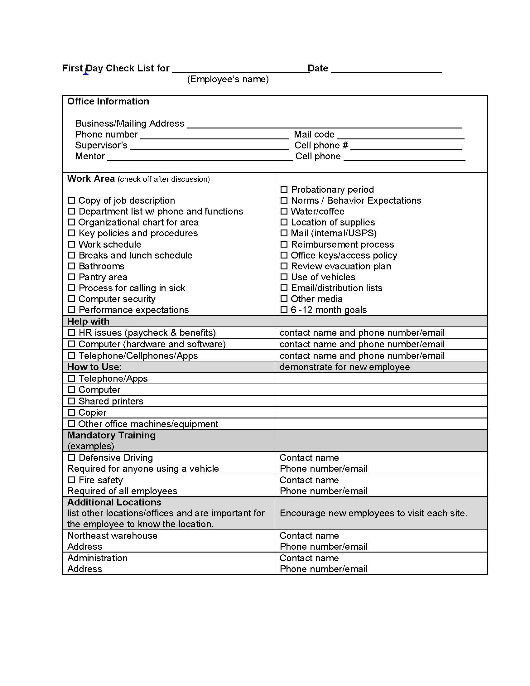 Below, is an example of an onboarding checklist. This checklist focuses primarily on work functions. You can make it a more comprehensive checklist by adding elements that need to be completed before the new hire starts and those things that create a welcoming atmosphere.